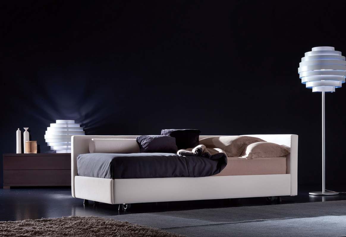 The Vinci bed from Italian manufacturer Axil. The frame is made from solid wood, legs - metal, fabric - textiles from a range of campaigns. A single model on wheels. The product is designed for bedroom in a modern style. The design of complementary decorative pillows. Colors: white, orange.