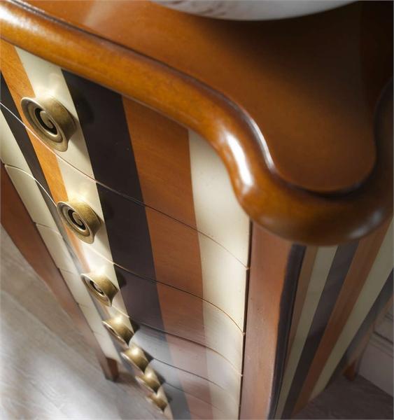 High chest of drawers from Italian manufacturer Domus Mobili. A model with multiple drawers. Body and legs made from solid wood. The surface is treated with glossy varnish from the company portfolio. Handle round shape made of metal.