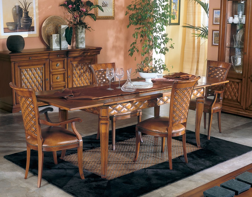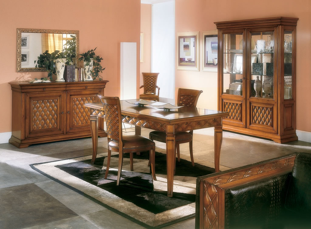 Set for the dining room from Italian manufacturer Bakokko. Set includes dining table, chairs, sideboard and dresser. The furniture is made of veneer wood, the surface is treated bee Waskom. Shutters and shelves sideboard - glass. Upholstery chairs - leather. Chairs with high back. Set in a classic style. Colors: natural wood color, brown.