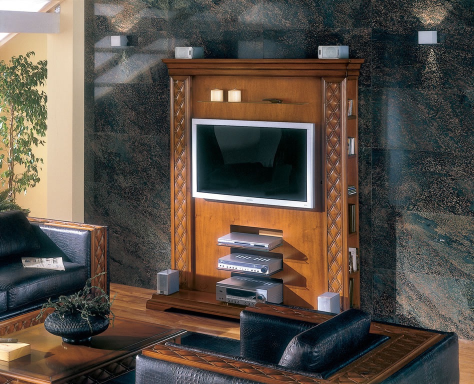 Modular storage system from Italian manufacturer Bakokko. The frame is made from veneer wood, the surface is treated with beeswax. Shelves - glass. Module for TV with space for DVD. A great choice for the living room in a classic style. Product color natural wood.