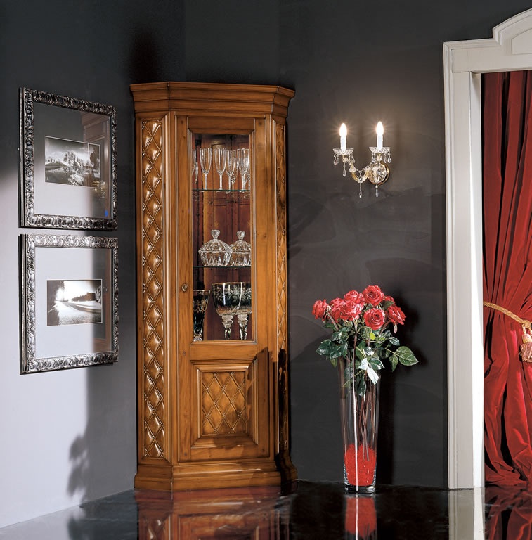 Showcase from Italian manufacturer Bakokko. The frame is made from veneer wood, the surface is treated bee Waskom. Fold and shelves - glass. Angular model with built-in illumination. A great choice for the living room in a classic style. Product color natural wood.