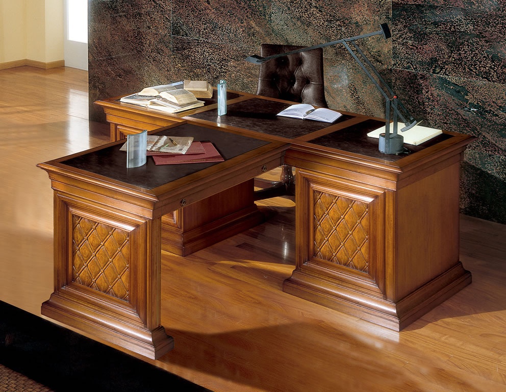 Writing table from Bakokko Italian manufacturer. The frame is made from veneer wood, upholstered in top leather. Great model to decorate the office in a classic style. Colors: brown, natural color of the wood.