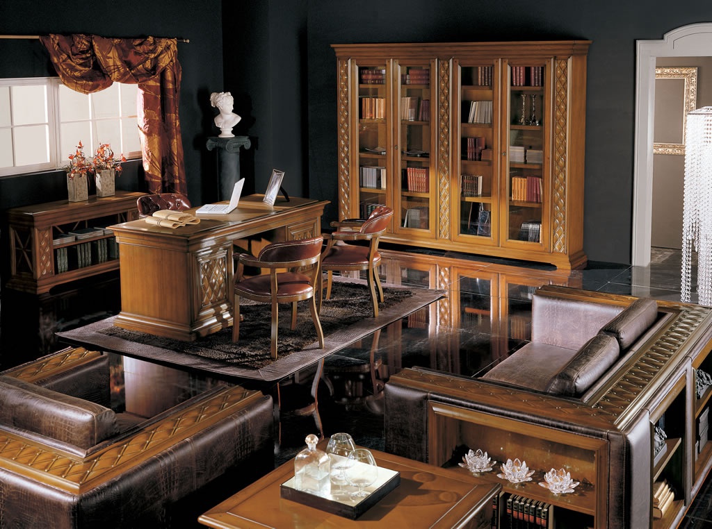 Headsets for the office from the Italian manufacturer Bakokko. Set includes Desk, bookcase and chairs. The furniture is made of veneer wood, the surface is treated bee Waskom. Cabinet doors - glass. Chairs upholstered in natural leather. Colors: brown, natural color of the wood.