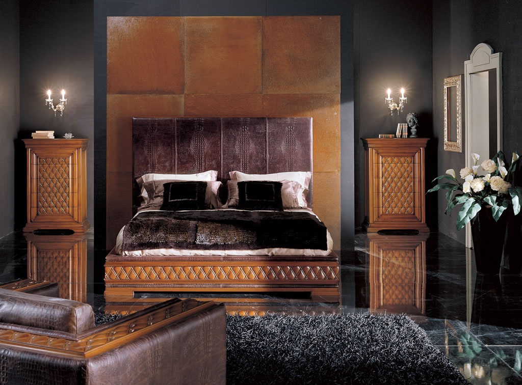 Headsets for bedrooms from Italian manufacturer Bakokko. Set includes double bed with high headboard and two chest of drawers. The furniture is made of veneer wood, the surface is treated bee Waskom. Headboard upholstered in leather. Set in a classic style. Colours in stock.