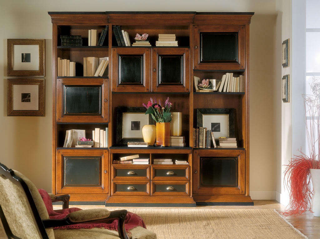 Modular storage system from Italian manufacturer Bakokko. The frame is made from veneer wood, the surface is treated bee Waskom. Handles - metal. Wall for books with drawers and hinged doors. A lovely choice for the living room in a classic style. Sash blind. Colors: natural wood color, black.