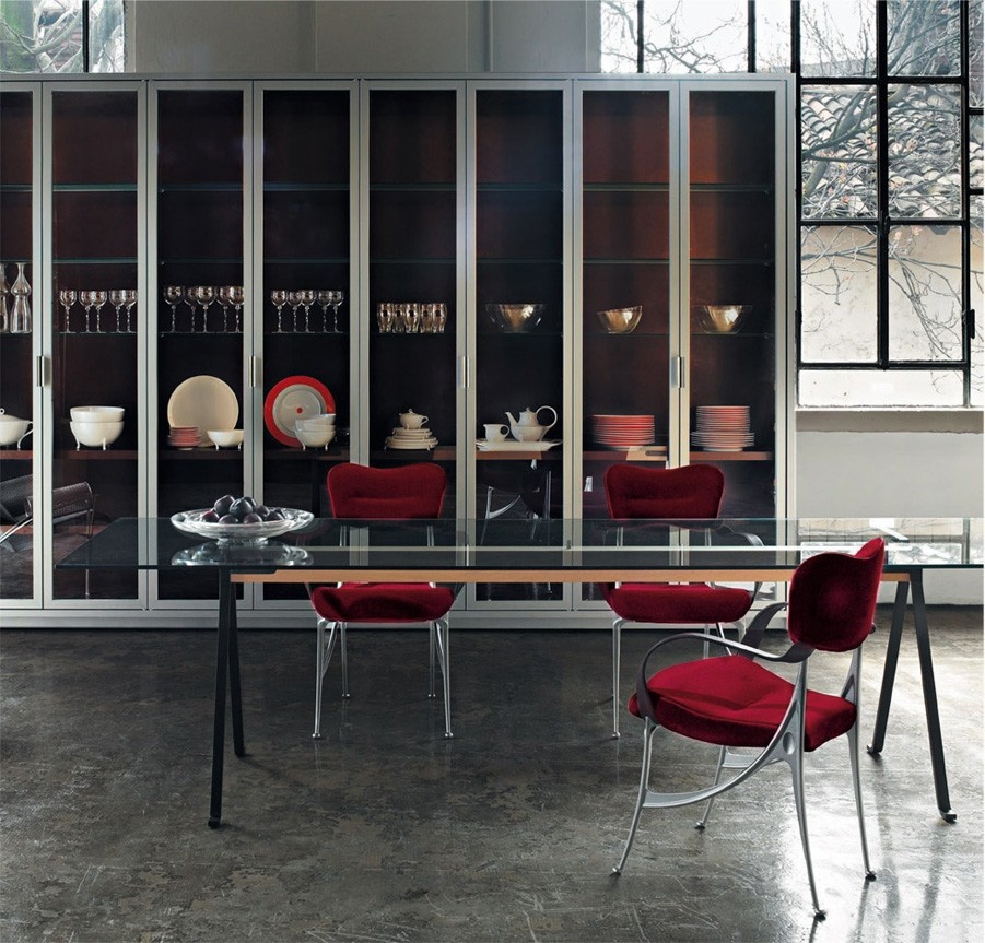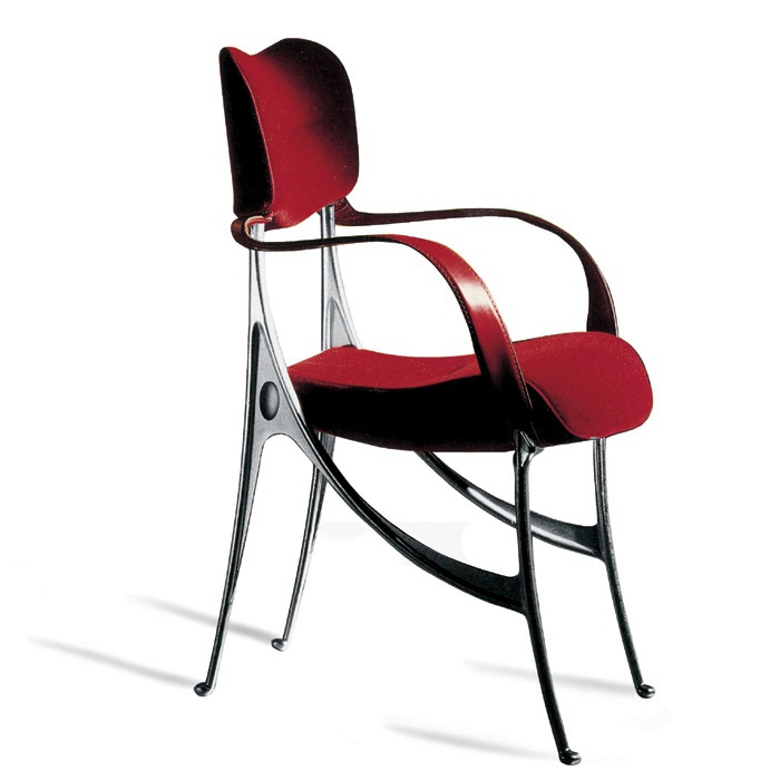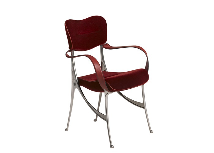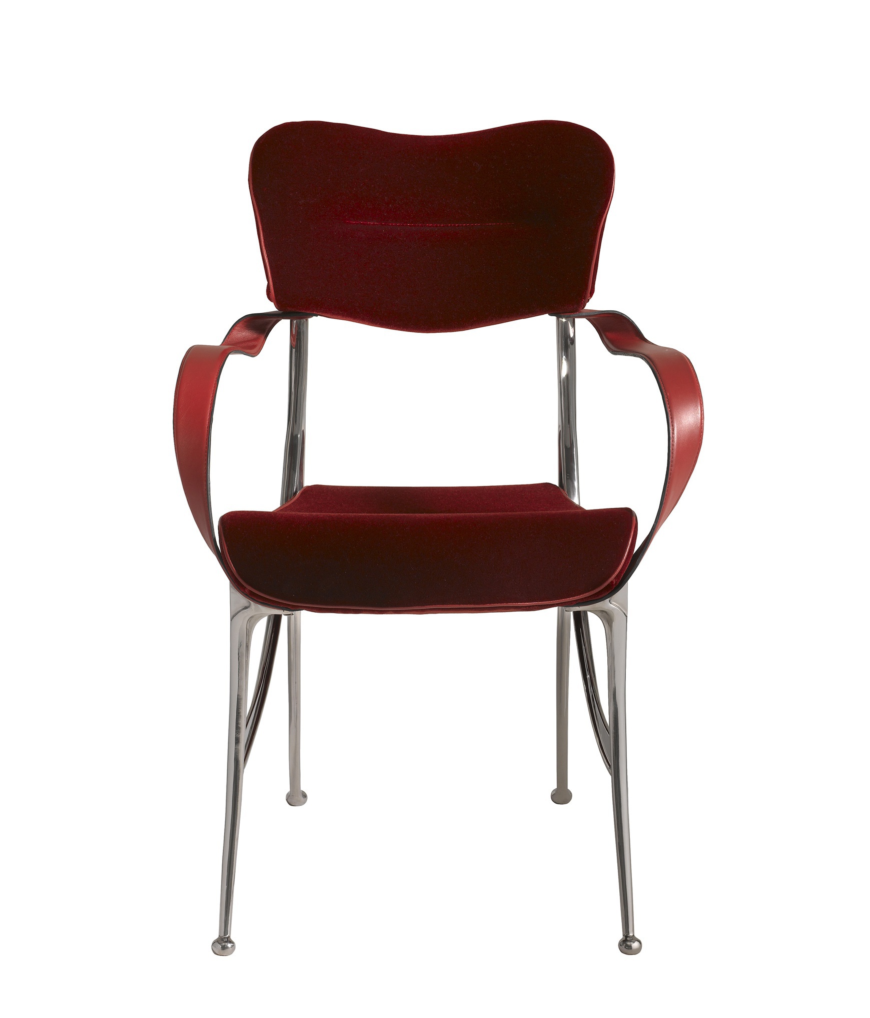 Chair Lucas from the Italian manufacturer Driade. Legs and frame made of polished stainless steel. The curved armrests are made of steel, completely covered with red skin. Seat and back upholstered in red velvet, the filler of polyurethane foam. Colors to choose from a range of companies. Design model perfectly fit into the interior of your living room or dining room in contemporary style.
