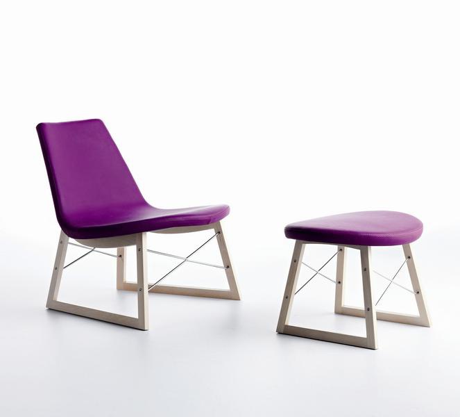 Chair Ray lounge chair from the Italian manufacturer Horm. The model is made in modern style. The frame is made from solid wood. Legs are in the form of skids connected by metal elements. Finish - gloss lacquer and wood veneer. Upholstery of textile leather or a choice from the collection of the company. In addition, it is proposed the pouf in the same design.