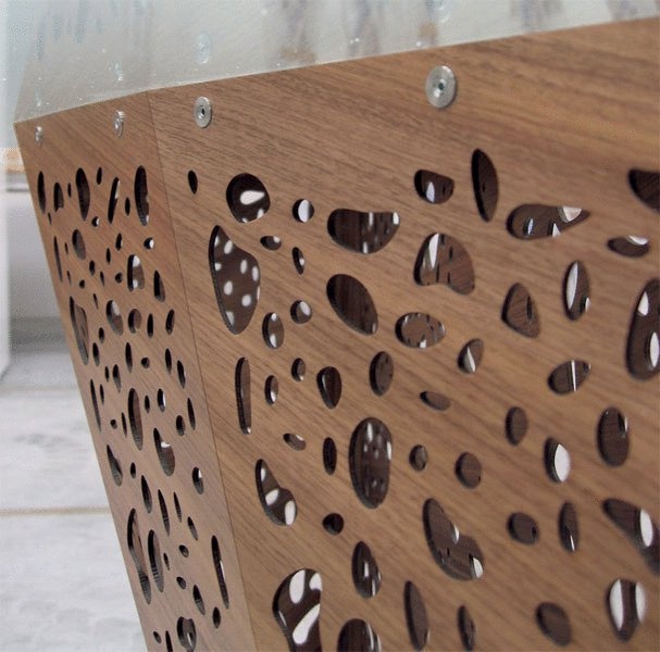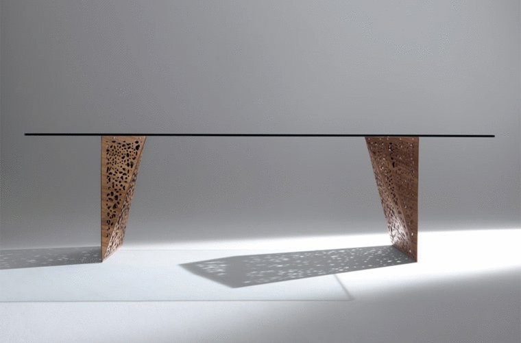 Riddled dining table from Italian manufacturer Horm. The model is made in modern style. The original design attach legs with decorative holes. The table-top of rectangular shape made of transparent glass of high quality. The model can be extended with built-in lighting.