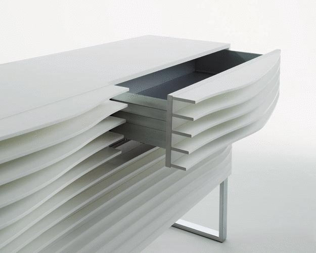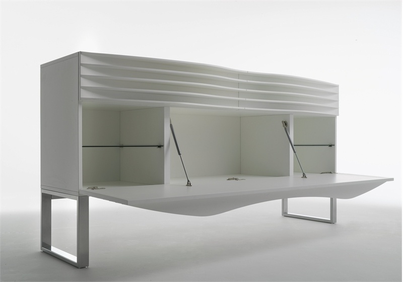 A chest of drawers from Italian manufacturer Horm. The model includes several drawers and swing-out door. The legs are made from chromed metal. The surface is treated with glossy varnish. Color options - white, red, black, silver, mocha, gold and green. The originality of the design gives a wavy facade. Made a chest of drawers in a modern style.