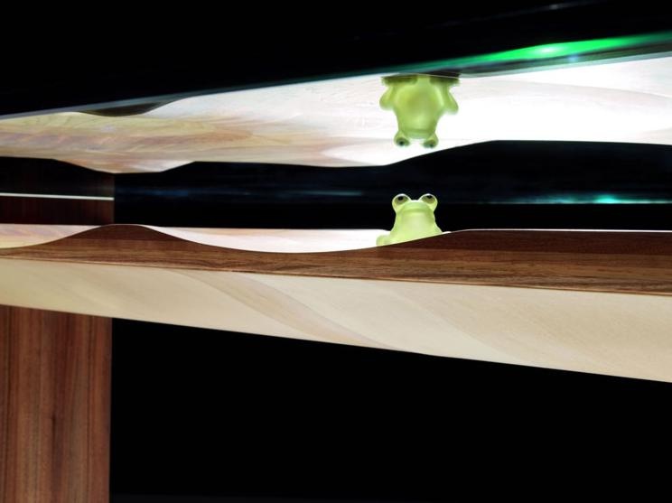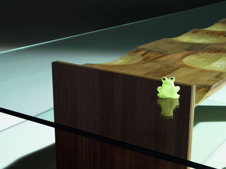 Dining table Ripples from the Italian manufacturer Horm. Model on a frame of solid wood. Legs are covered with veneer from the company portfolio. The table top is rectangular. Material - transparent glass of high quality. The table is made in a modern style.
