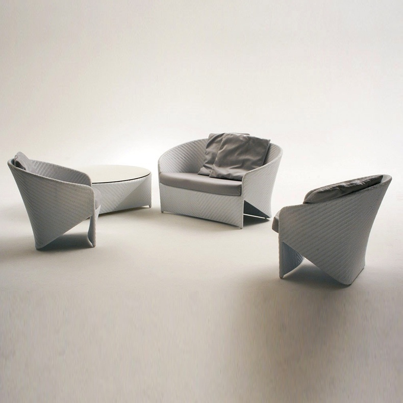 Sofa set from the Italian manufacturer Bonacina Pierantonio. Set includes double sofa, armchairs and coffee table. Furniture made of solid rattan. The seat filler - foam, upholstery - textiles from a range of campaigns. The design of complementary decorative pillows. Set in a contemporary style. Color products grey.