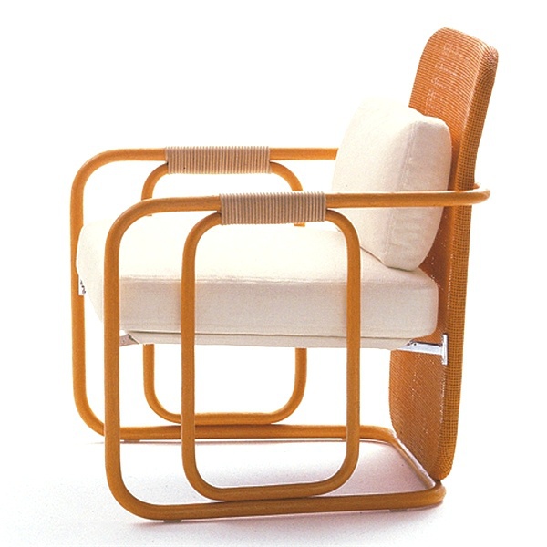 The Rdp chair from the Italian manufacturer Bonacina Pierantonio. The frame is made of metal, filler - foam, upholstery - textiles from a range of campaigns. The seat is removable. Model with a high back designed for summer furniture in modern style. The design complements decorative pillow. Colours in stock.