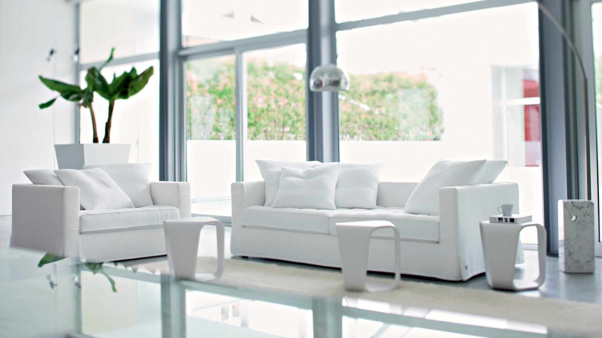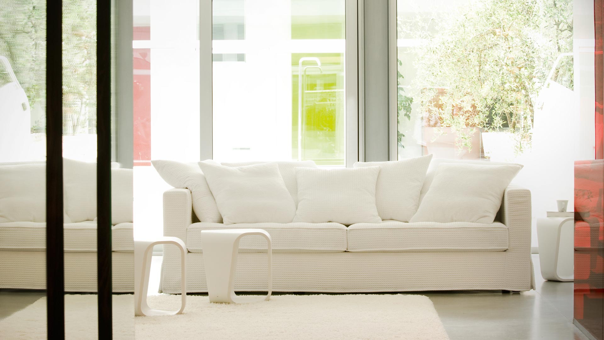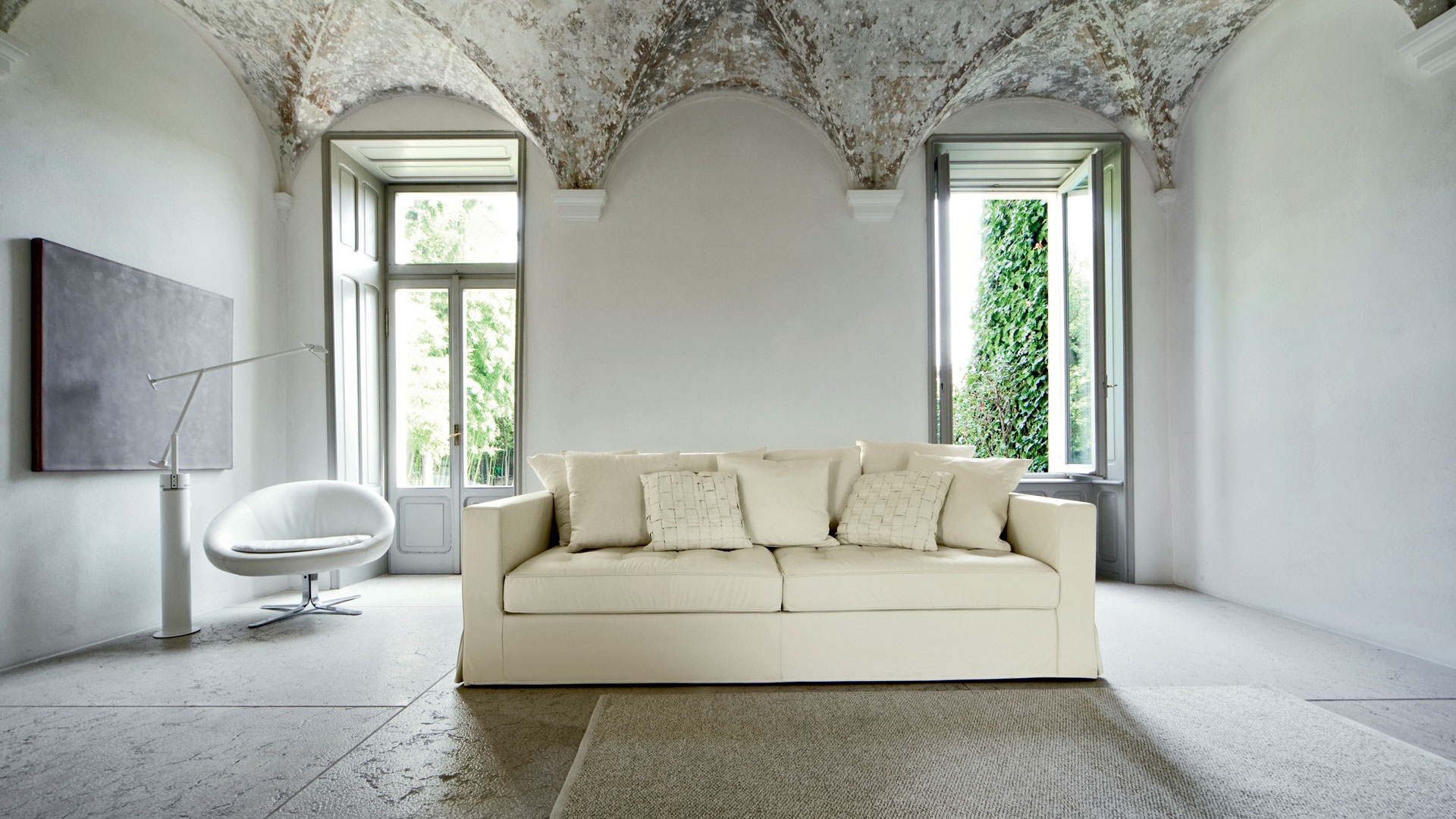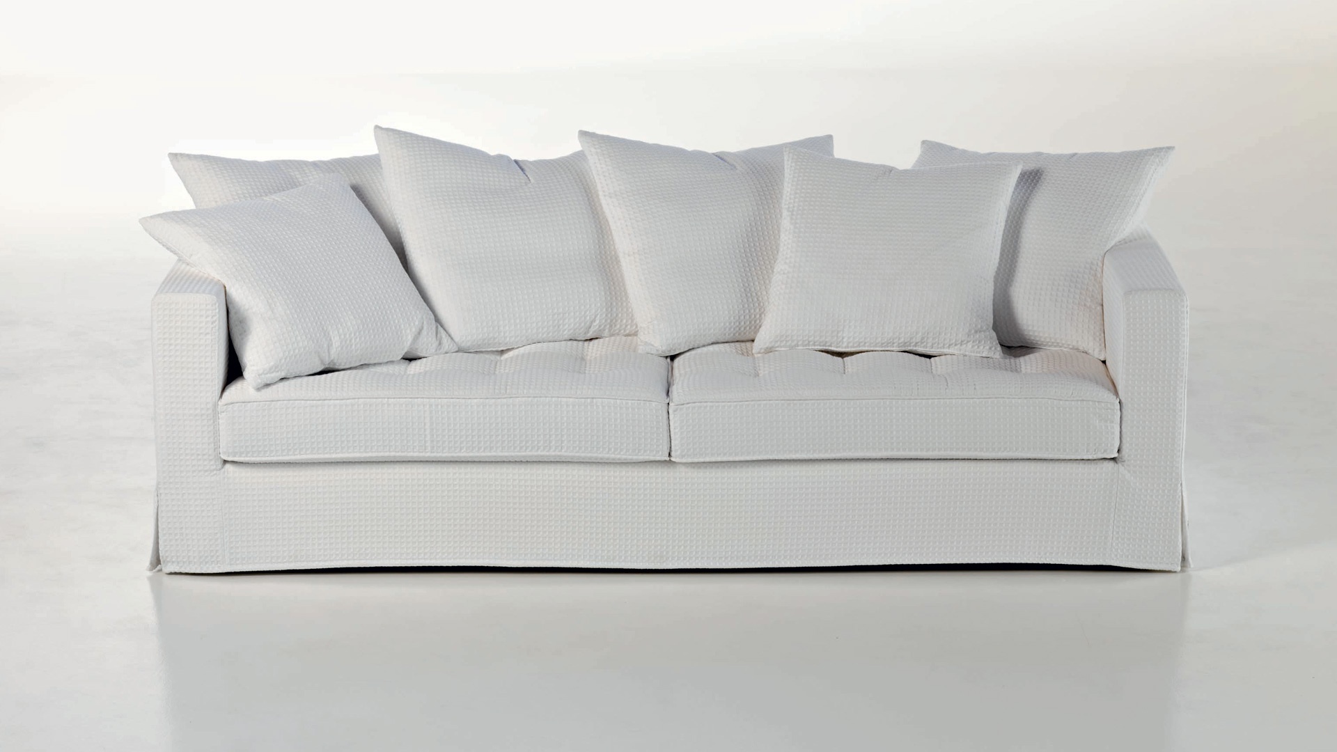 Sofa Sound of silence from the Italian manufacturer Busnelli. Structure made in solid wood, plywood and particle Board, the filling of polyurethane foam of density and 100% polyester fiber. Back cushion entirely of goose feathers. Upholstery - textiles from a range of campaigns. The base is hidden a decorative "skirt". Double model for living room in modern style. The design of complementary decorative pillows. Product color white.