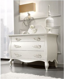 A chest of drawers from Italian manufacturer Bova. The frame is made of solid wood, surface treated with glossy varnish from the company portfolio. Decorative accessories - shiny metal. Model with three drawers. A great choice for the bedroom in art Deco style. Product color white.