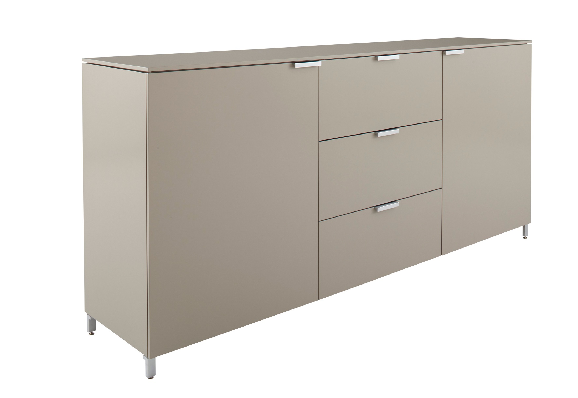 Dresser sideboard EVERYWHERE from French manufacturer Ligne Roset. Model on low legs. Includes drawers and sections with hinged doors. Finish - gloss lacquer white or anthracite. The glass door painted with lacquer. Upper top made of aluminum. Made a chest of drawers in a modern style.