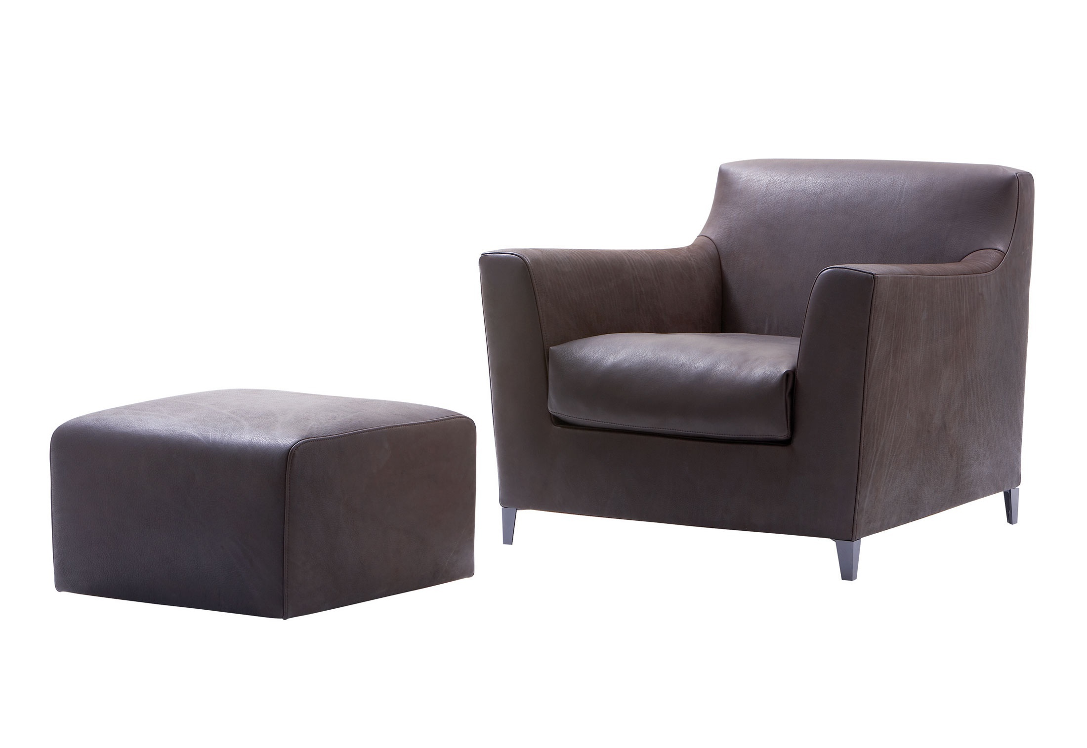 The RIVE DROITE armchair armchair from the French manufacturer Ligne Roset. Model with a square backrest and armrests. Seat cushion is removable. Material - wood and metal. The upholstery leather collection company. In addition, it is proposed Ottoman leg similar design. A chair made in a contemporary style.