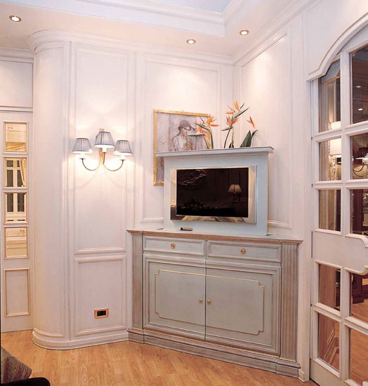 Corner chest of drawers from Italian manufacturer Bucalossi. The frame is made from solid wood. Model with two doors and two drawers. Colours in stock.