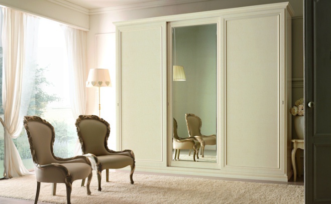 The Cabinet is from Italian manufacturer San Michele. The frame is made from solid wood. Finishing varnish from the company portfolio. Color - white. The Cabinet is made with sliding doors and mirror. The model will perfectly complement a classic bedroom interior.