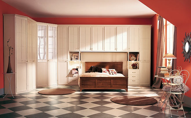 Bedroom (Suite bedroom) from the Italian manufacturer San Michele. Set includes: double bed with headboard, a modular storage system with nisai for bed, table and chair. The frames are made of wood. Finish - white lacquer and brown, from the company portfolio.