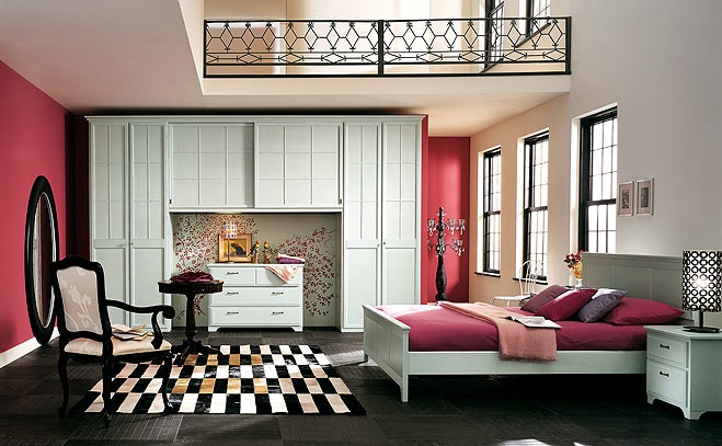 Bedroom (Suite bedroom) from the Italian manufacturer San Michele. Set includes: double bed with headboard, a modular storage system with nisai for chest of drawers, bedside Cabinet and an armchair with fabric upholstery. The frames are made of wood. The finishing - varnish. Colors - white, black and beige. The model is made in modern style.