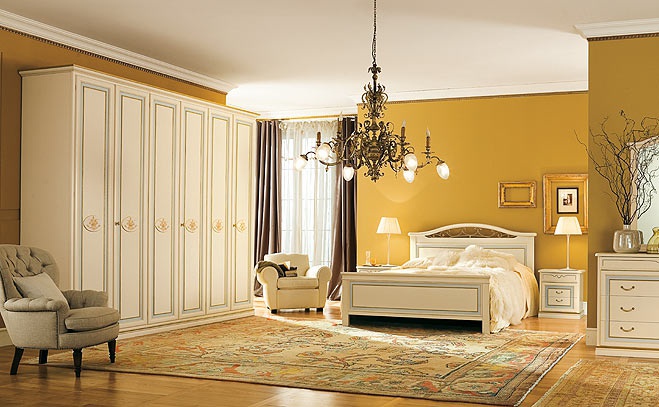 Bedroom (Suite bedroom) from the Italian manufacturer San Michele. Set includes: double bed with headboard and footboard, chair, wardrobe, chest of drawers and bedside Cabinet. The frames are made of wood. The finishing - varnish. Color scheme - white. The model is made in modern style.
