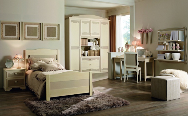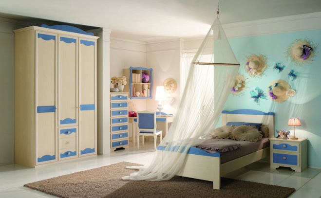 Bedroom (Suite bedroom) from the Italian manufacturer San Michele. Set includes: twin bed with headboard, wardrobe, chest of drawers, Desk, bedside Cabinet and chair. The frames are made of wood. The finishing - varnish. Colors - white and blue. The model is made in modern style.