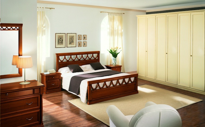 Bedroom (Suite bedroom) from the Italian manufacturer San Michele. Set includes: double bed with headboard, wardrobe, chest of drawers and bedside Cabinet. The frames are made of wood. The finishing - varnish. Colors - white and brown. The model is made in modern style.