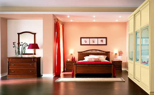 Bedroom (Suite bedroom) from the Italian manufacturer San Michele. Set includes: double bed with headboard and footboard, wardrobe, bedside Cabinet and drawers. The frames are made of wood. The finishing - varnish. Colors - white and brown. The model is made in modern style.