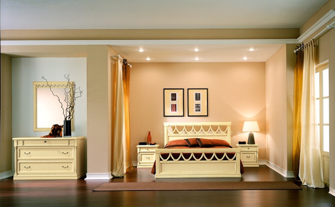 Bedroom (Suite bedroom) from the Italian manufacturer San Michele. Set includes: double bed with headboard and footboard, chest of drawers and bedside tables. The frames are made of wood. The finishing - varnish. Color scheme - white. The model is made in modern style.