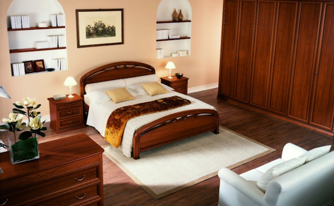 Bedroom (Suite bedroom) from the Italian manufacturer San Michele. Set includes: double bed with headboard, wardrobe, chest of drawers, bedside tables and chair in fabric. The frames are made of wood. The finishing - varnish. Colors - white and brown. The model is made in modern style.
