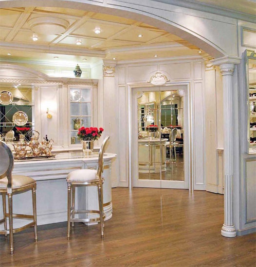 Collection of furniture for the kitchen from Italian manufacturer Bucalossi. The frame is made from solid wood. Includes deaf and glazed storage units, desks, island, wall panels and coffered ceilings. Classic style series decorative column supports. The facades of the deaf modules in the fringing of Golden color. Each model is made according to individual dimensions provided by the customer. Colours in stock.