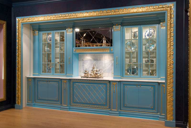 frame: solid wood doors, shelves: glass finish: carved finish: gilding |