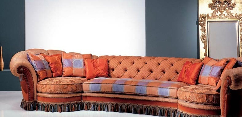 Modular sofa Can Can, from the Italian manufacturer Smiam. The frame is made from solid wood. Upholstery - textiles from the company portfolio. Colours - Burgundy. The model is decorated with textile brushes and pillows. The back is decorated with stitch Capito.