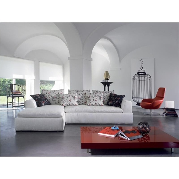 Miro modular sofa from Italian manufacturer Natuzzi. The model is made in modern style. Low legs are made of metal. The case is completely covered with textile. Color option - white. Low back is complemented with decorative pillows of different sizes.