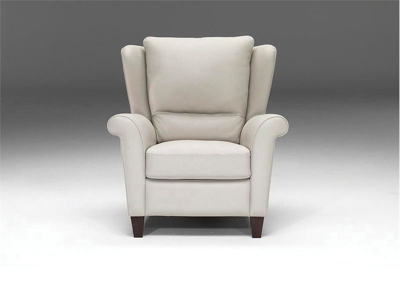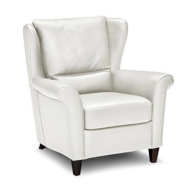 The Samuel chair armchair from Italian manufacturer Natuzzi. Model with a high back and rounded armrests. The frame and legs made from solid wood. The upholstery is leather. The color of this model is white. The seat cushion and backrest is soft. A chair made in a contemporary style.