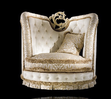 Armchair, from the Italian manufacturer Socci Anchise. The frame is made of solid wood of valuable breeds. Filler - polyurethane foam. Upholstery - textiles from the company portfolio. The back is decorated with carved elements. The design of complementary decorative pillows. The model is made in the Rococo style.