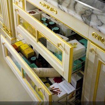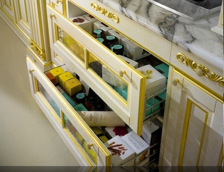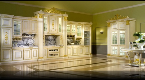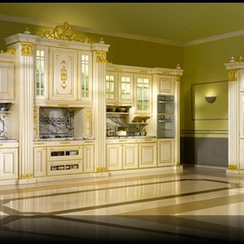 Kitchen (Suite kitchen), from the Italian manufacturer Soccio Anchise. The frame is made of solid wood of valuable breeds. Doors - glass. D?cor - gilding. The model is decorated with inlaid handmade. Colors - white and gold. Set is made in the Rococo style.