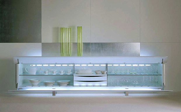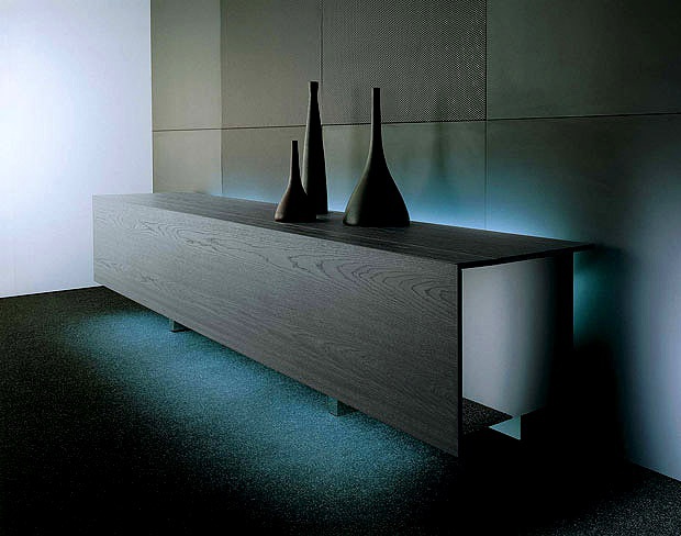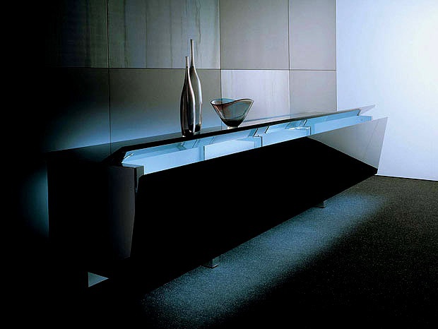 The Ludwig sideboard from Italian manufacturer Acerbis. Model on a steel frame. Top top and fronts made from particleboard. The finish offers high gloss lacquered white, red or black. Internal filling - glass shelves. The design complements the built-in backlight.