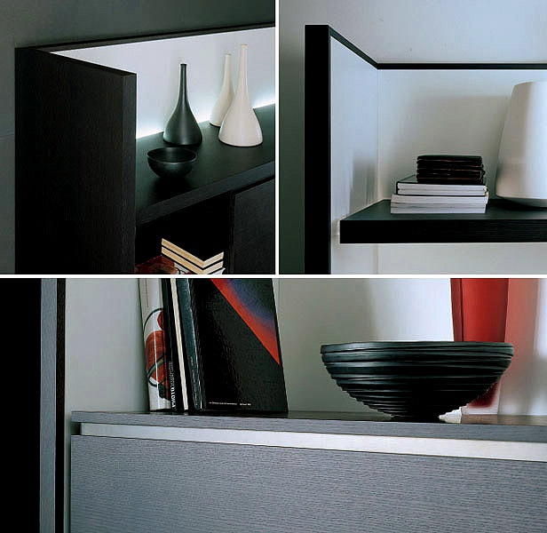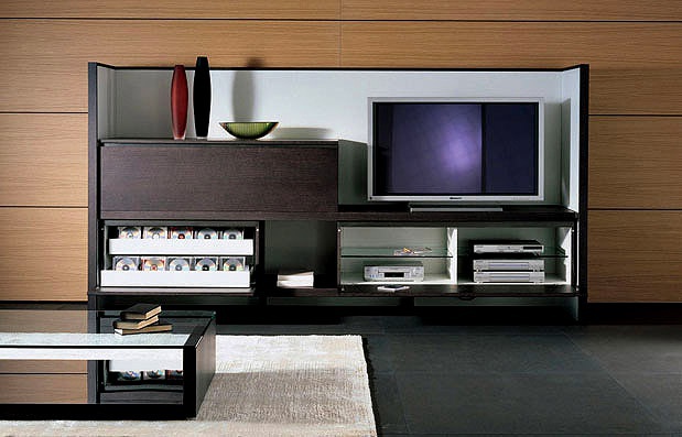 Newbury modular system from Italian manufacturer Acerbis. The model includes a number of open shelves and closed sections for storage. There is a place for TV. Material - solid wood. Finish offered with veneer or Matt lacquer. Shelves made of transparent glass. Different capacity and originality of design.