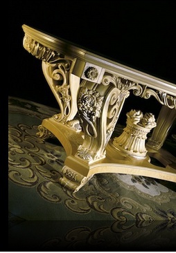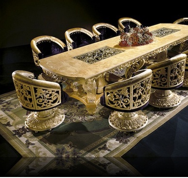 Dining room (dining set) from the Italian manufacturer Socci Anchise. Set includes obedennyi table and chairs. The furniture is made of solid wood of valuable breeds. Filler - polyurethane foam. Upholstery - textiles from the company portfolio. Set decorated with inlay and carvings.