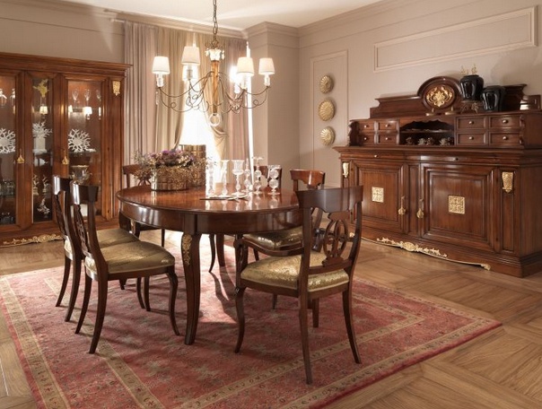 Dining room (dining set) from the Italian manufacturer Stella del Mobile. Set includes: sideboard, showcase, dining table and chairs. Frames made from solid wood. Upholstery - textiles from the company portfolio. Doors - glass. Finish - lacquer and carving. The model is made in classic style.