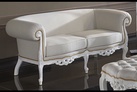 Double couch from the Italian manufacturer-Seven sedie perfectly. The frame is made from solid wood. The seat filler - foam, upholstery - textiles from the company portfolio. Colors - white and beige. The armrests are slightly wrapped. The lower frame is decorated with carvings.