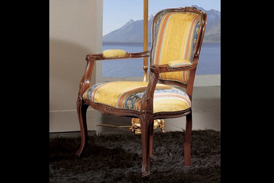 A chair from the Italian manufacturer-Seven sedie perfectly. The model is made in classic style. The frame and legs are wood. The surface is treated with glossy varnish. Seat and back covered with textiles. Colors in the catalog of the company. Decoration is the decorative carving handmade.