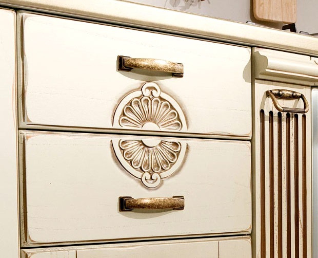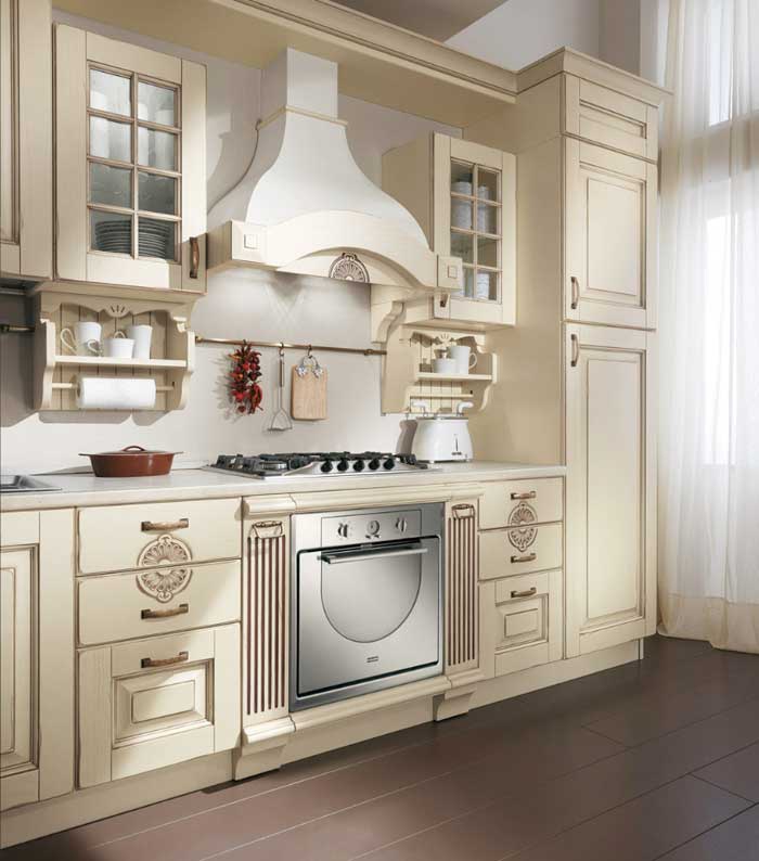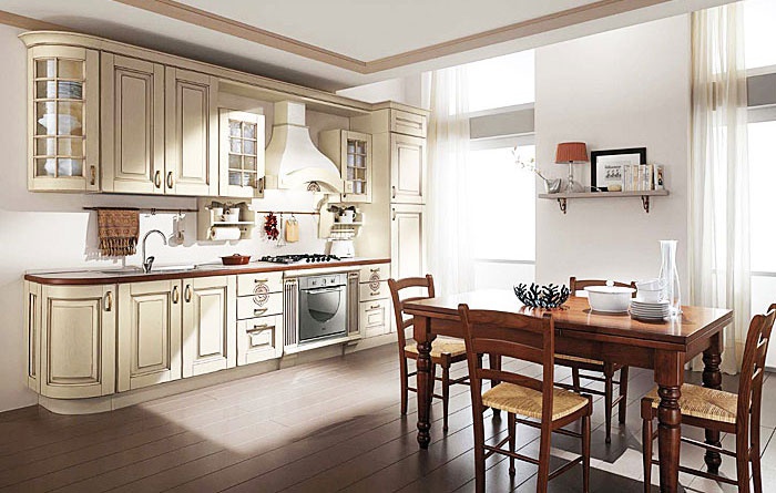 Kitchen from Italian manufacturer Vismap. The frame is made from solid wood. Working area - natural stone. The model is made in modern style. Includes deaf and glazed storage units. Colours in stock.