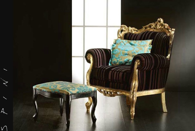 Armchair, from the Italian PROIZVODITELYA Spini. The frame is made of wood. Upholstery - textiles from the company portfolio. Backrest decorated with carved decoration. The model is made in the Rococo style.