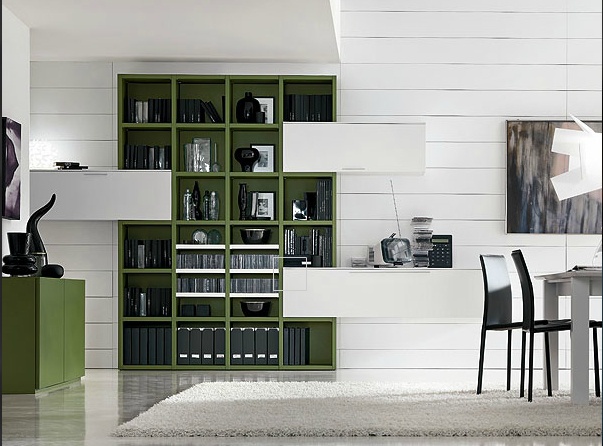 Modular system from Italian manufacturer Santa Lucia. Consists of several open and closed shelves and sections. The frame is made from solid wood. Colors: green and white. The system is designed to store books and other things. The model is made in a modern style.