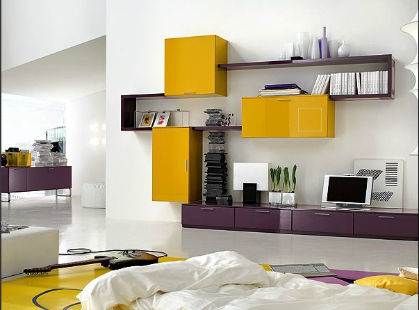 Modular system from Italian manufacturer Santa Lucia. Includes open shelves and closed sections for storage. The frame is made from solid wood. Finish - lacquer or veneer from the company portfolio. There is a place for TV. Colors - yellow and purple.