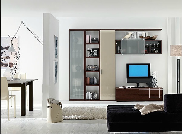Modular system from Italian manufacturer Santa Lucia. Includes open shelves and closed sections for storage. The frame is made from solid wood. The finishing - varnish. Colors - beige and brown. There is a place for TV. The modular system is manufactured in contemporary style.