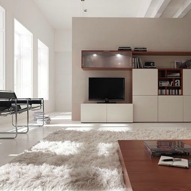 Modular system from Italian manufacturer Santa Lucia. The frame is made of wood. Finish - gloss lacquer white and beige. Door modules - wood or frosted durable glass. The system provides a special place for a panel TV. The model is made in modern style.