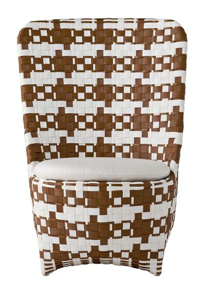 Cape West armchair armchair from Italian manufacturer Driade. Model with a high curved backrest. The frame is made of metal. Upholstery is a decorative weaving of plastic ribbons. Offers a wide range of color options. A chair made in a contemporary style.